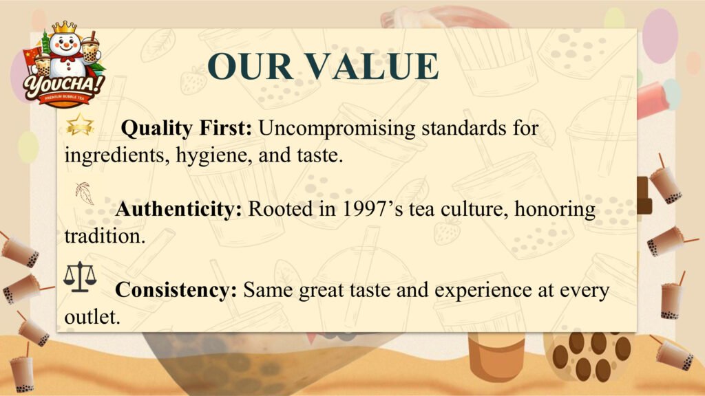 Today, YOUCHA continues its journey beyond borders, sharing the true taste of premium milk tea with the world one cup, one smile and one moment at a time. This is why our slogan is “More than tea, it’s a feeling”